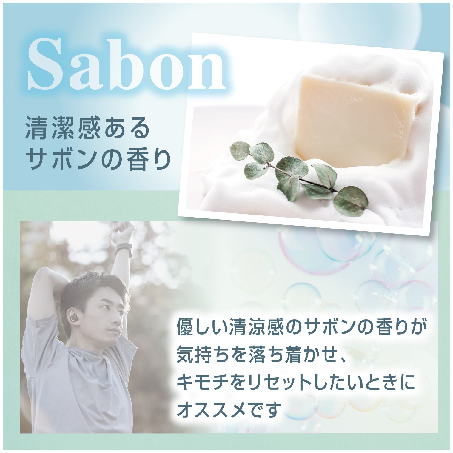 清潔感のあるサボンの香りは、高ぶる気持ちを鎮めリラックス高めたいときにオススメです。